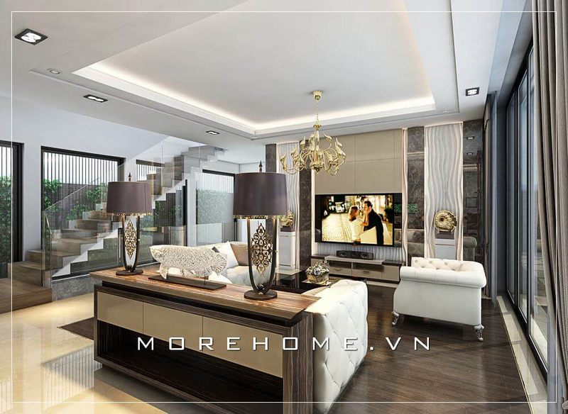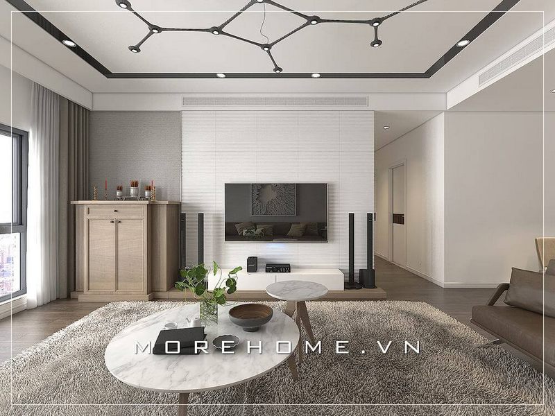Morehome đã thực hiện thiết kế và thi công các công trình nội thất trọn gói tại chung cư An Bình city. Hình ảnh thi công nội thất phòng khách này được thực hiện bằng gỗ công nghiệp với kệ tivi hiện đại và vách gỗ ốp tường. Nếu quý khách cần thi công hoặc thiết kế nội thất cho chung cư An Bình city, hãy liên hệ Morehome để được tư vấn.