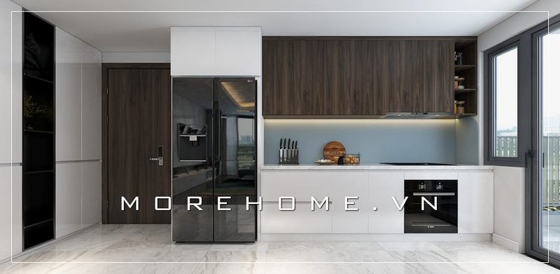 Xu hướng hiện nay chú trọng đến việc sử dụng các vật liệu sáng màu và gương phản chiếu để tạo cảm giác mở rộng cho không gian. Đặc biệt, tủ bếp tích hợp thông minh, với các ngăn kéo và kệ di động, không chỉ giúp tiết kiệm diện tích mà còn đảm bảo công năng sử dụng cao.